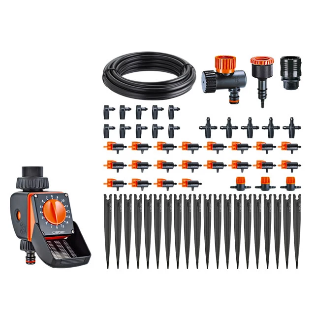 Battery water timer with pre-set programs, tap connector, flexible hose, couplings, pressure stabiliser, adjustable drippers: everything you need to easily create a drip system for potted plants without using any tools, adjusting the amount of water delivered to each individual plant and choosing from 15 different programs, by simply rotating a knob. Ideal for DIY projects and also as a gift idea.