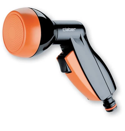Lightweight and compact shower pistol with wide and gentle spray. It features an ergonomic grip, handy front-mounted push-button mechanism for controlling and shutting off the water flow and 2 flow settings.