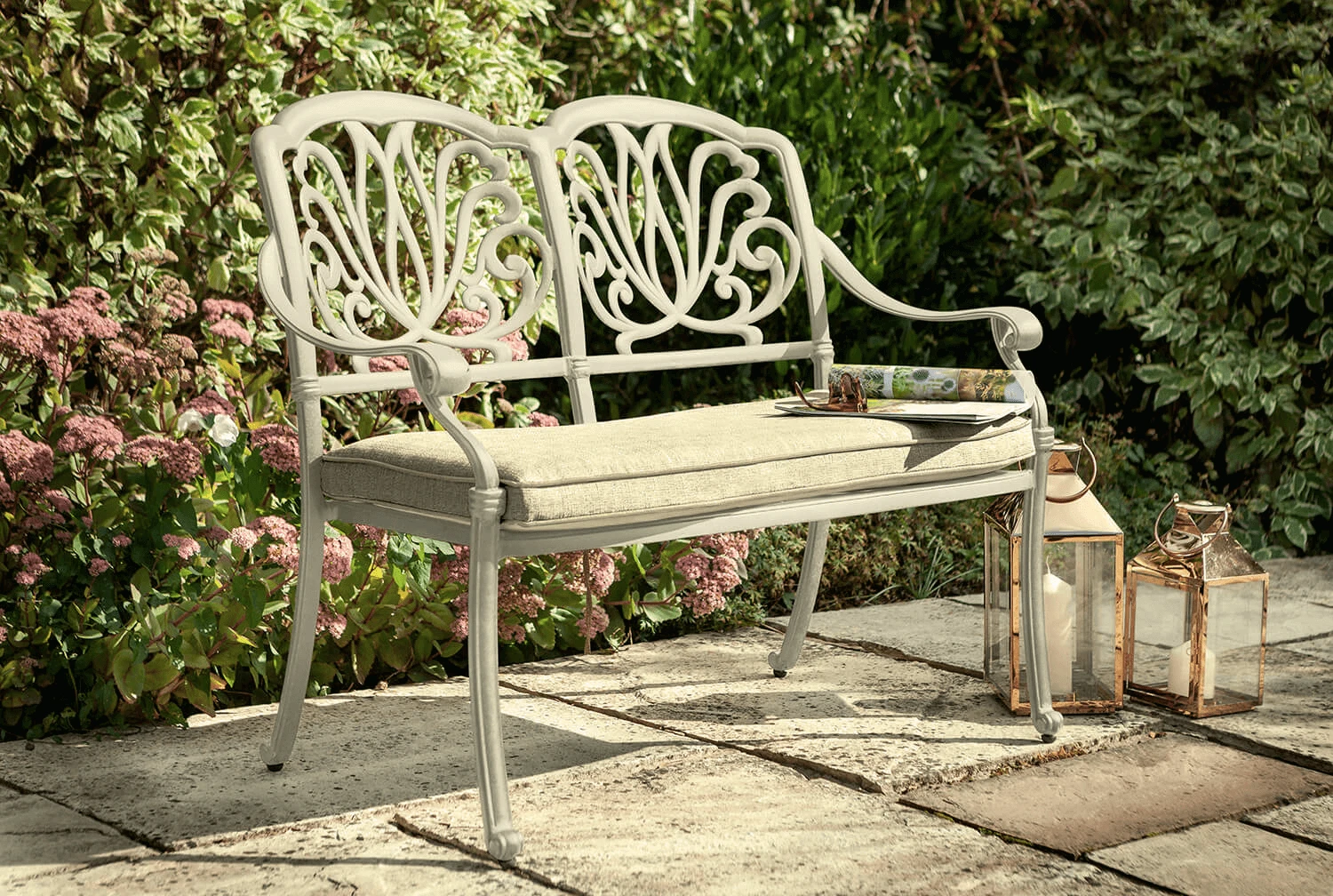 It is made from hard-wearing cast aluminium, making it durable and weather resistant. It will not rust and can be left outside all year round without any need to cover. The cushion included with this bench is Weatherready and can be left in place all summer long. The bench features adjustable feet which can be altered to accommodate uneven ground.