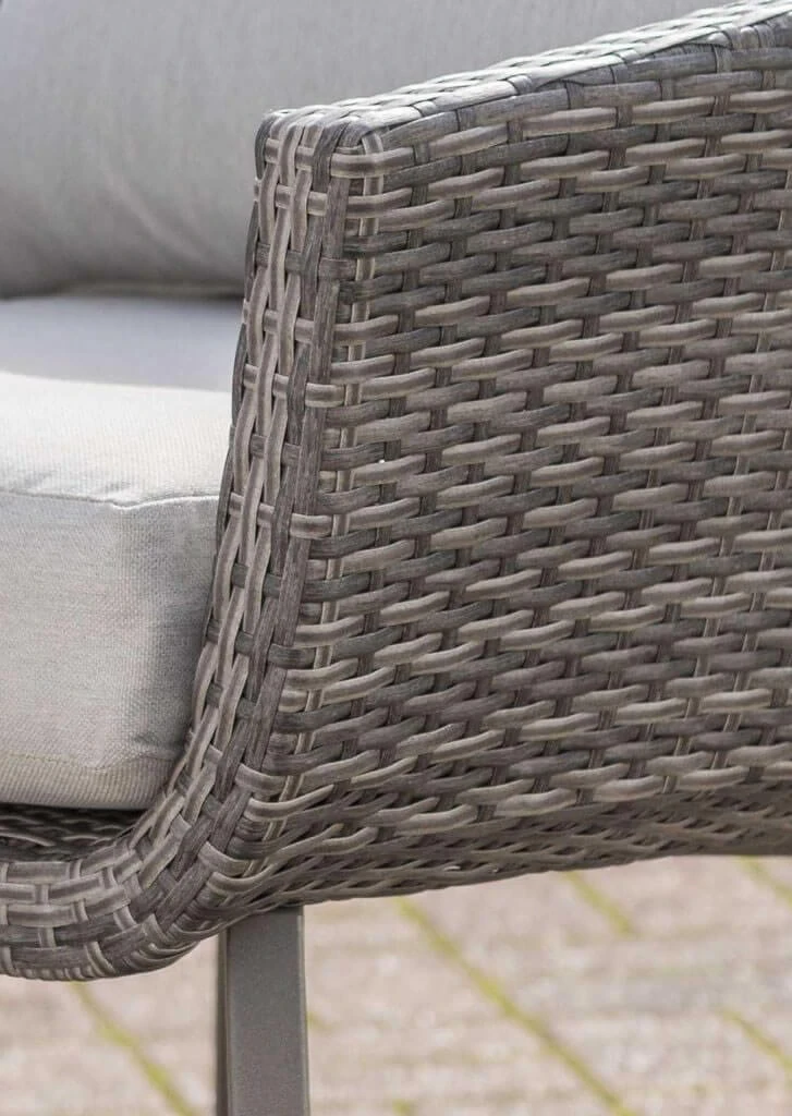 The set is made using 6mm flat synthetic wicker which is hard-wearing and weatherproof. This has been handwoven on to a study aluminium frame and has a contemporary two-tone effect to it.