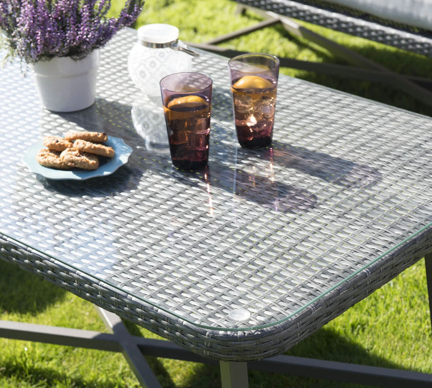 The 6mm flat weave on the set is synthetic which makes it hard-wearing and weatherproof. It has been handwoven on to an aluminium frame which means this set, excluding cushions, can be left out all year long.