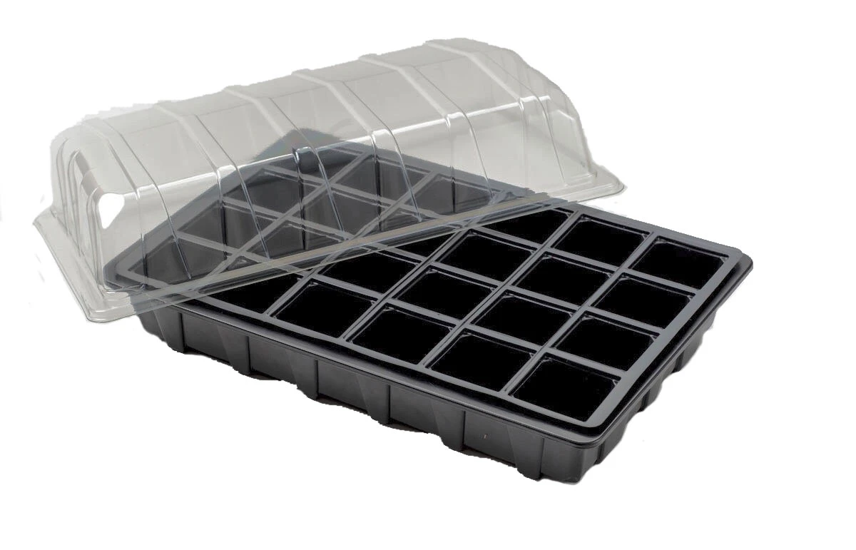 Each propagator measures 38cm (15 inches) in length, 24cm (9.5 inches) wide and is 5cm (2 inches) deep. The propagator including the lid measures 8cm (3 inches) at its highest point. Each cell in this 24-cell seed tray measures 3.2cm (1.3 inches) width, 3.2cm (1.3 inches) length and 5cm (2 inches) in height.