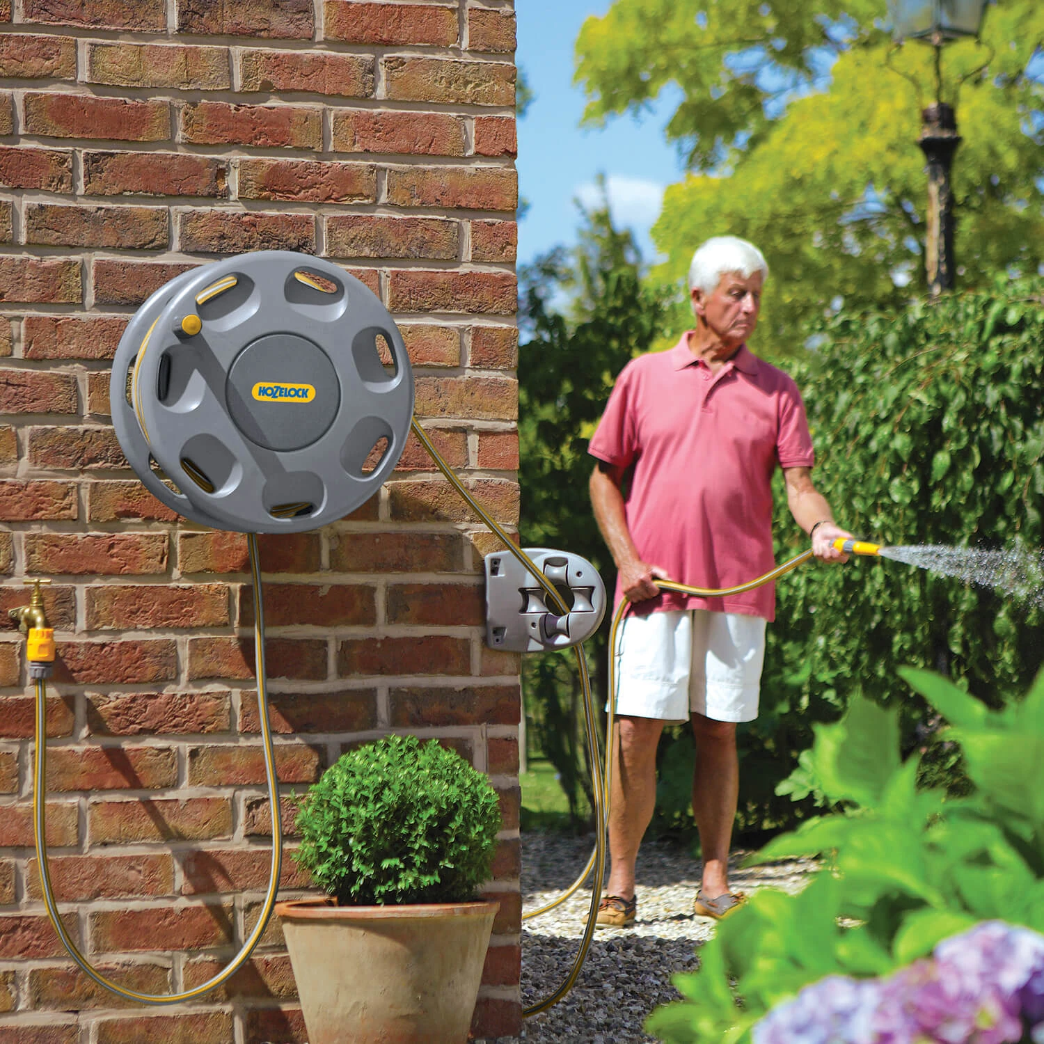 Mounts onto a wall or the corner of a building and guides the hose easily around, reducing the possibility of damage to the hose in use.